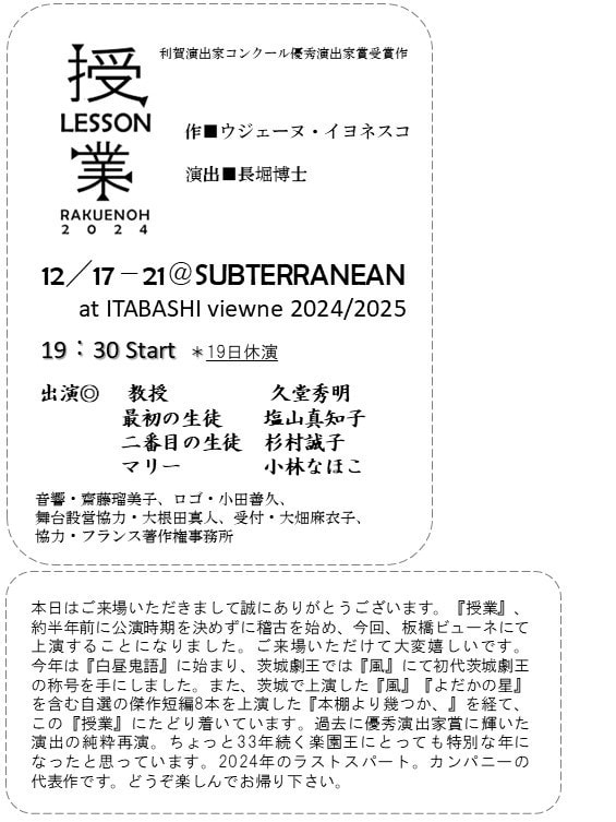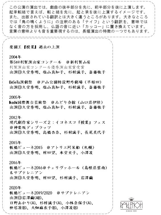 『授業』は、利賀演出家コンクールで優秀演出家賞を受賞した作品です。自他共に認められた作品、って紹介をしてきていますが、嘘ではないと思います。20年間ずっと、同じ演出で上演してきて、上演の手応えは変わりません。演劇には、特に歌舞伎などで使われる言葉として有名ですが、「型」という考え方があります。長らく、この同じ演出で上演してきていて、これが『授業』の上演の一つの「型」に昇華されたとまで考えるようになりました。ぜひ、観ていただきたいと考えています。ここまで自画自賛するなんて、ちょっと恥ずかしいですが、本当、心からおススメですので。どうぞよろしくお願いいたします。